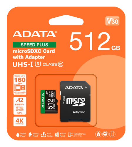 ADATA Speed Plus. Kapazität: 512 GB, Flash Card Typ: MicroSDXC, Flash-Memory-Klasse: Klasse 10, Lesegeschwindigkeit: 180 MB/s, Schreibgeschwindigkeit: 160 MB/s, UHS Speed Klasse: Class 3 (U3), Video-Geschwindigkeitsklasse: V30. Schutzfunktion: Tropfsicher, Magnetsicher, Temperaturbeständig, Wasserdicht, Röntgensicher, Produktfarbe: Schwarz, Grün, Weiß