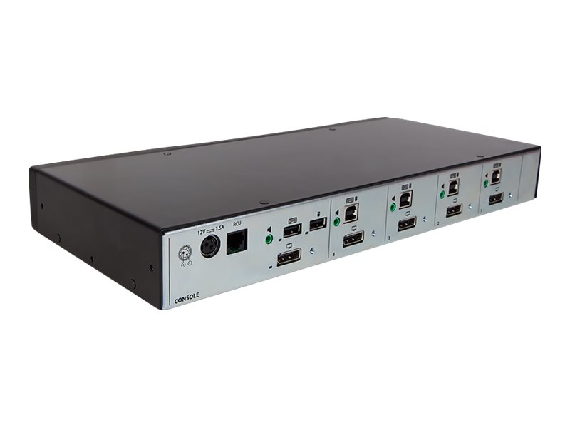 Gerätetyp: KVM-/Audio-Switch - 4 Anschlüsse,Gehäusetyp: Desktop,Untertyp: KVM,Ports: 4 x KVM/Audio,Anz. lokale KVM-Benutzer: 1 lokaler Benutzer,Tastatur-/Mausschnittstelle: USB,Max Auflösung: 3840 x 2160 @ 60 Hz,Leistungsmerkmale: 4K-Auflösung, Manipulationsschutz,Schnittstellen: 4 x DisplayPort/HDMI-Eingang ¦ 4 x USB Type B ¦ 1 x DisplayPort/HDMI-Ausgang ¦ 1 x Fernbedienung RJ-12 ¦ 2 x USB Type A ¦ 4 x Audioeingang Mini-Klinkenstecker ¦ 1 x Audioausgang Mini-Klinkenstecker,Stromversorgungsgerät: Externer Netzadapter,Gestellte Leistung: 18 Watt - DC 12 V,Erforderliche Netzspannung: Wechselstrom 120/230 V (50/60 Hz),Produktzertifizierungen: FCC Klasse A zertifiziert, TUV, NIAP PP 4.0,TAA-kompatibel: Ja,Erforderliches Betriebssystem: Apple MacOS, Linux, Microsoft Windows,Breite: 34.4 cm,Tiefe: 17.1 cm,Höhe: 4.4 cm,Gewicht: 1.6 kg,Min Betriebstemperatur: 0 °C,Max. Betriebstemperatur: 40 °C,Zulässige Luftfeuchtigkeit im Betrieb: 0 - 80% (nicht kondensierend),Min. Lagertemperatur: -20 °C,Max. Lagertemperatur: 60 °C