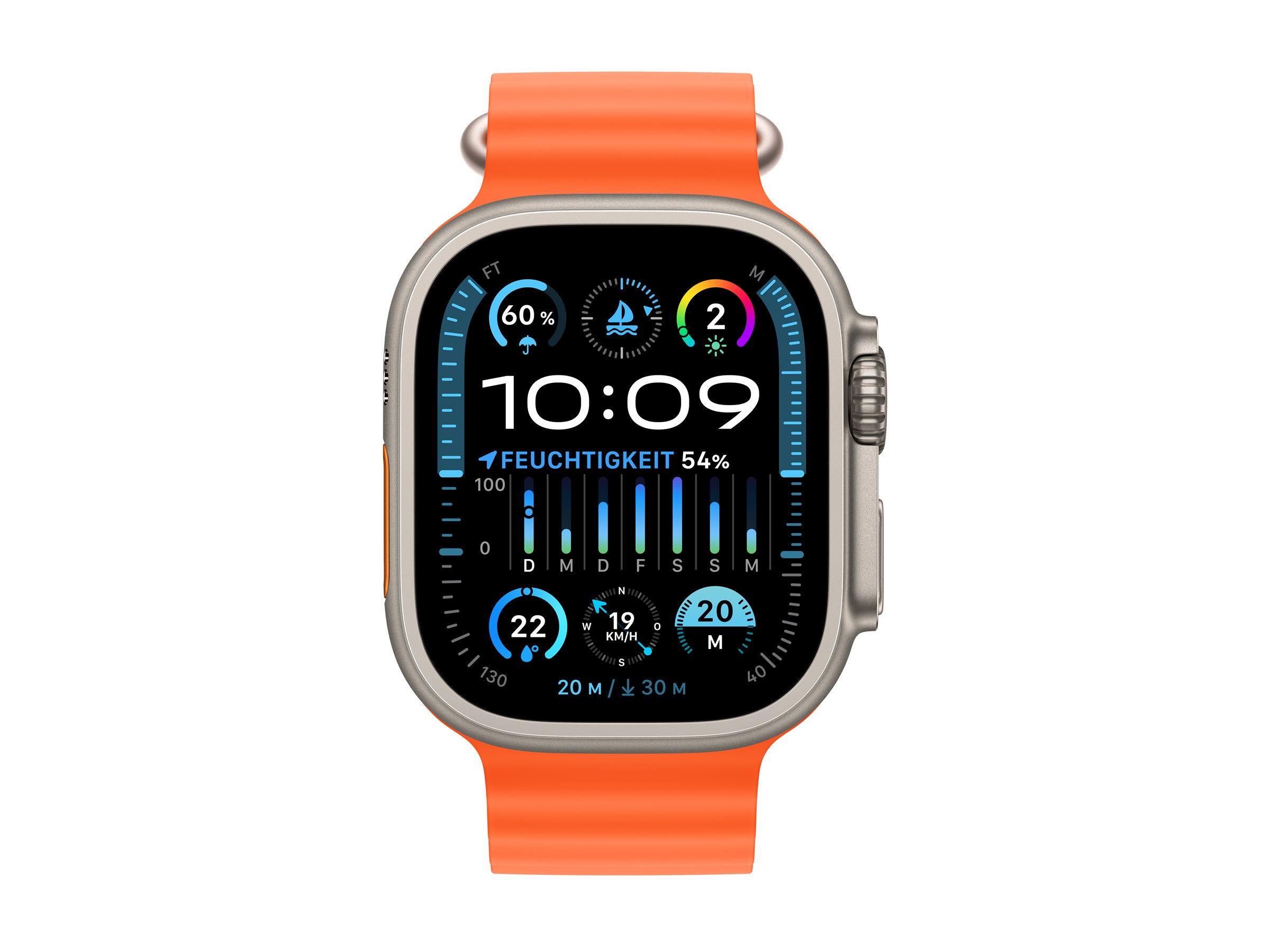 Apple Watch Ultra 2 . Bildschirmtechnologie: OLED, Display-Auflösung: 410 x 502 Pixel, Touchscreen. Flash-Speicher: 64 GB. GPS. Gewicht: 61,4 g. Wasserdicht bis: 100 m, Armbandfarbe: Orange