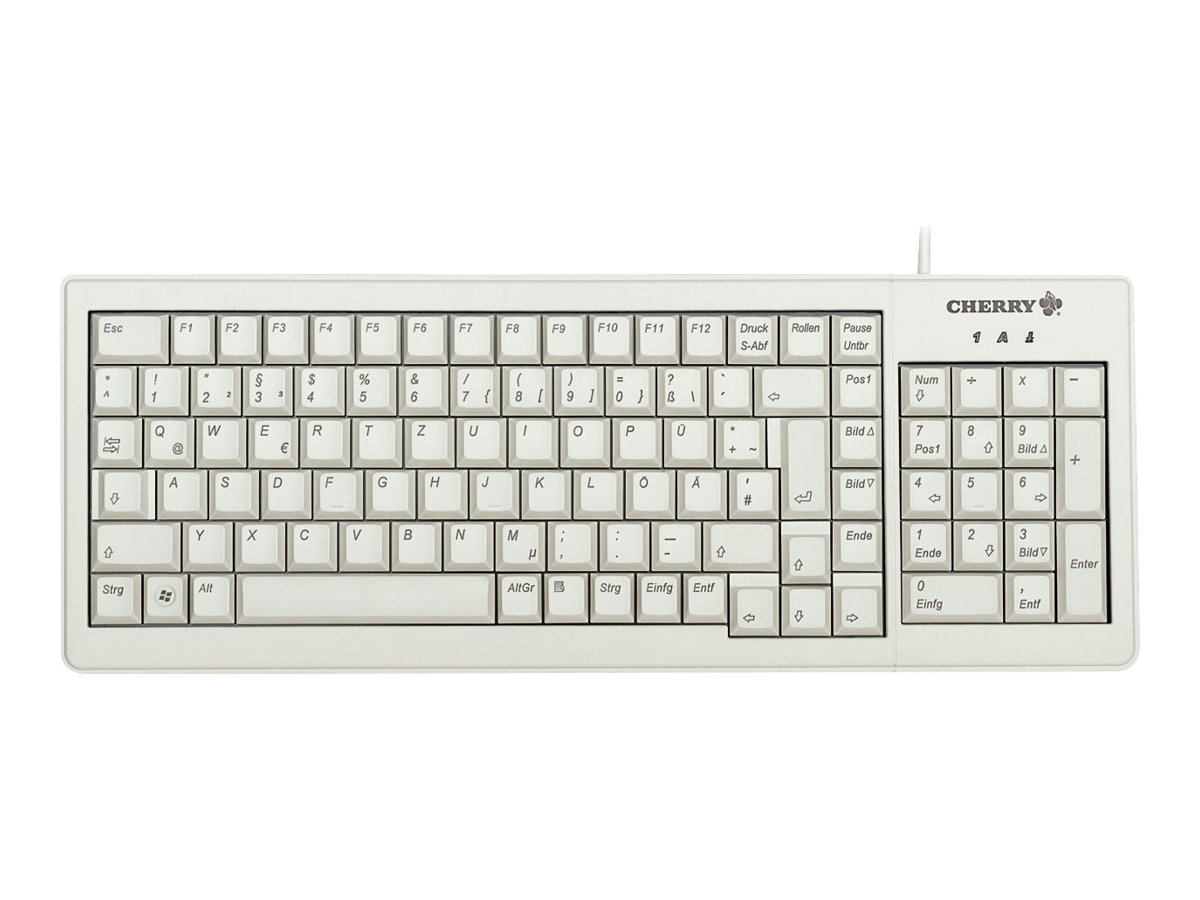 CHERRY XS G84-5200. Tastatur Formfaktor: Volle Größe (100%). Tastatur-Stil: Gerade. Übertragungstechnik: Kabelgebunden, Geräteschnittstelle: USB + PS/2, Tastatur-Switch: Mechanischer Switch, Tastaturaufbau: QWERTY, Tastatur - Tastenanzahl: 103. Kabellänge: 2,5 m. Empfohlene Nutzung: Büro. Produktfarbe: Grau