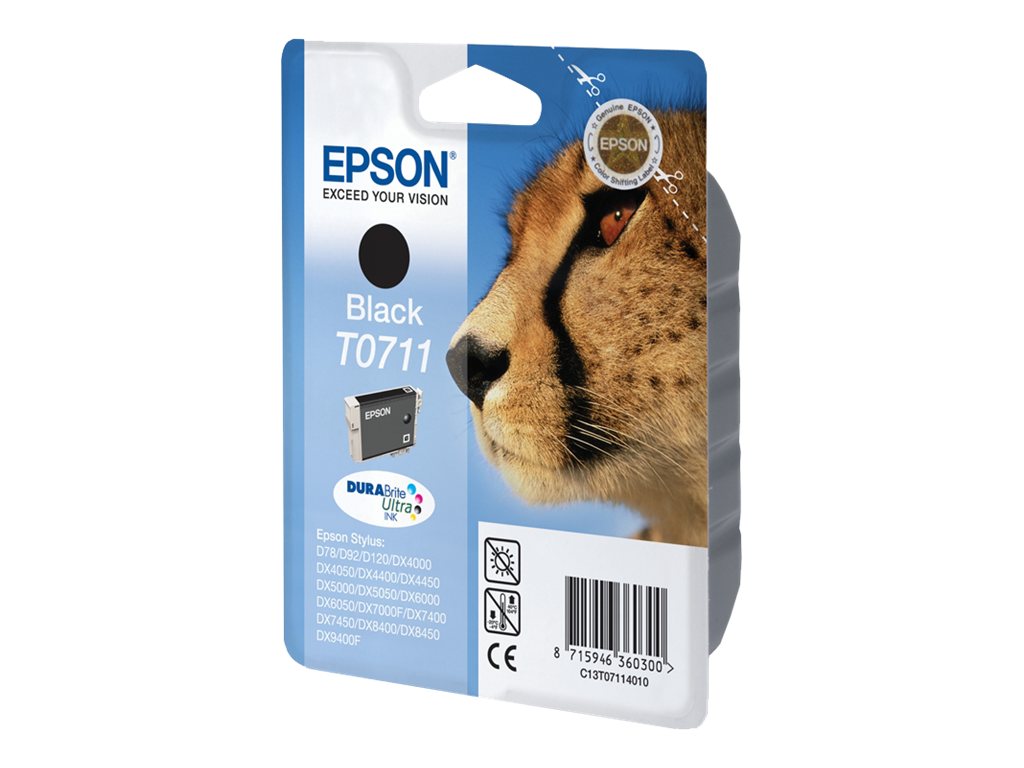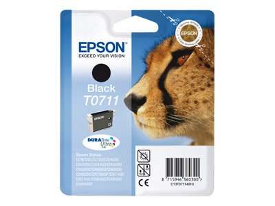 Epson Cheetah Tintenpatrone Black T0711 DURABrite Ultra Ink. Schwarzer Tintentyp: Tinte auf Pigmentbasis, Druckfarben: Schwarz, Menge pro Packung: 1 Stück(e)