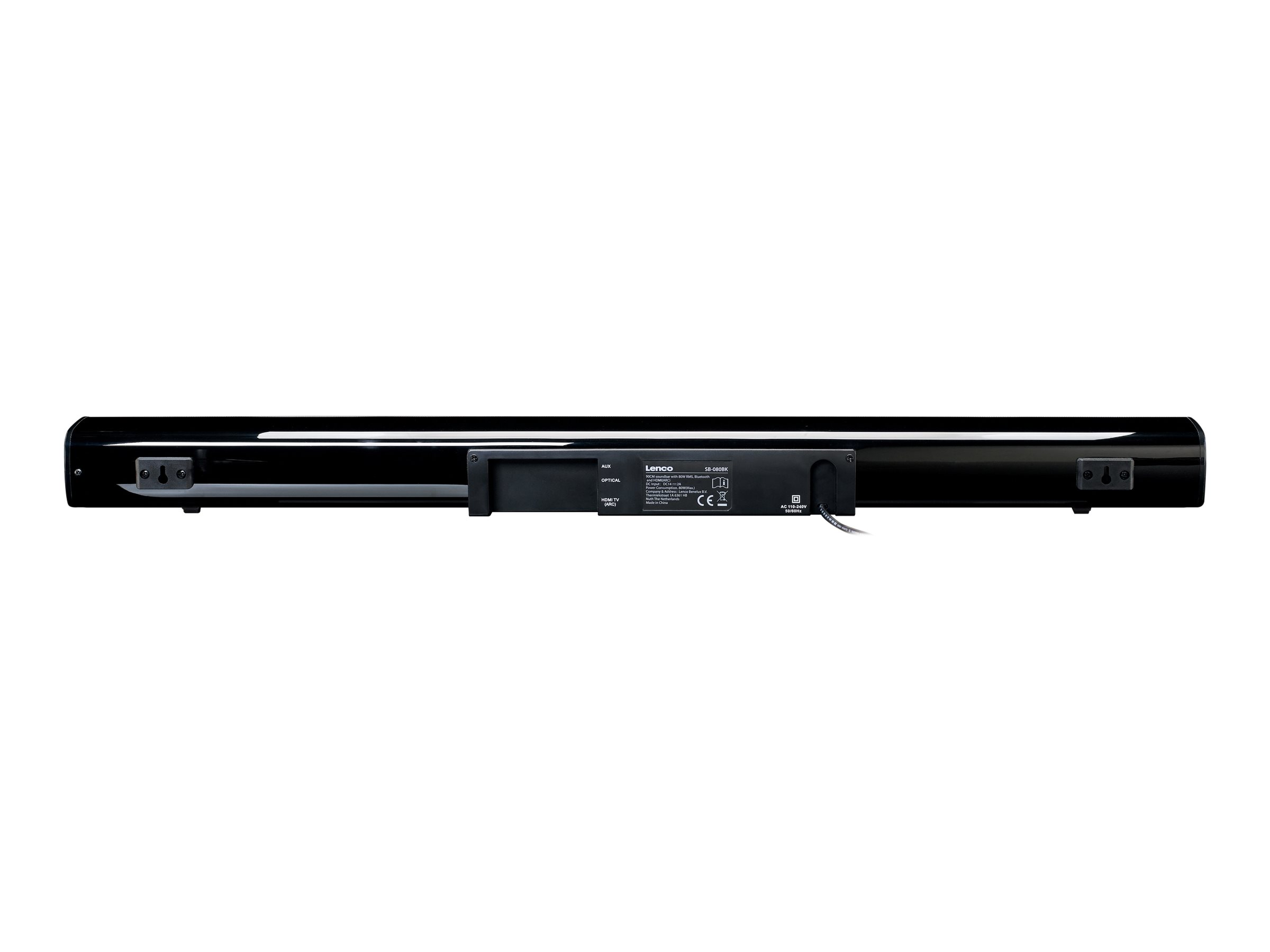 Lenco SB-080BK. Audio Kanäle: 2.1 Kanäle, RMS-Leistung: 80 W. Soundbar Lautsprecher RMS Leistung: 80 W, Rauschverhältnis (SNR): 72 dB, THD, totalklirren: 0,5%. Produktfarbe: Schwarz, Zertifizierung: CE. Übertragungstechnik: Verkabelt & Kabellos. AC Eingangsspannung: 110 - 240 V, AC Eingangsfrequenz: 50 - 60 Hz, Stromverbrauch (Standby): 0,33 W