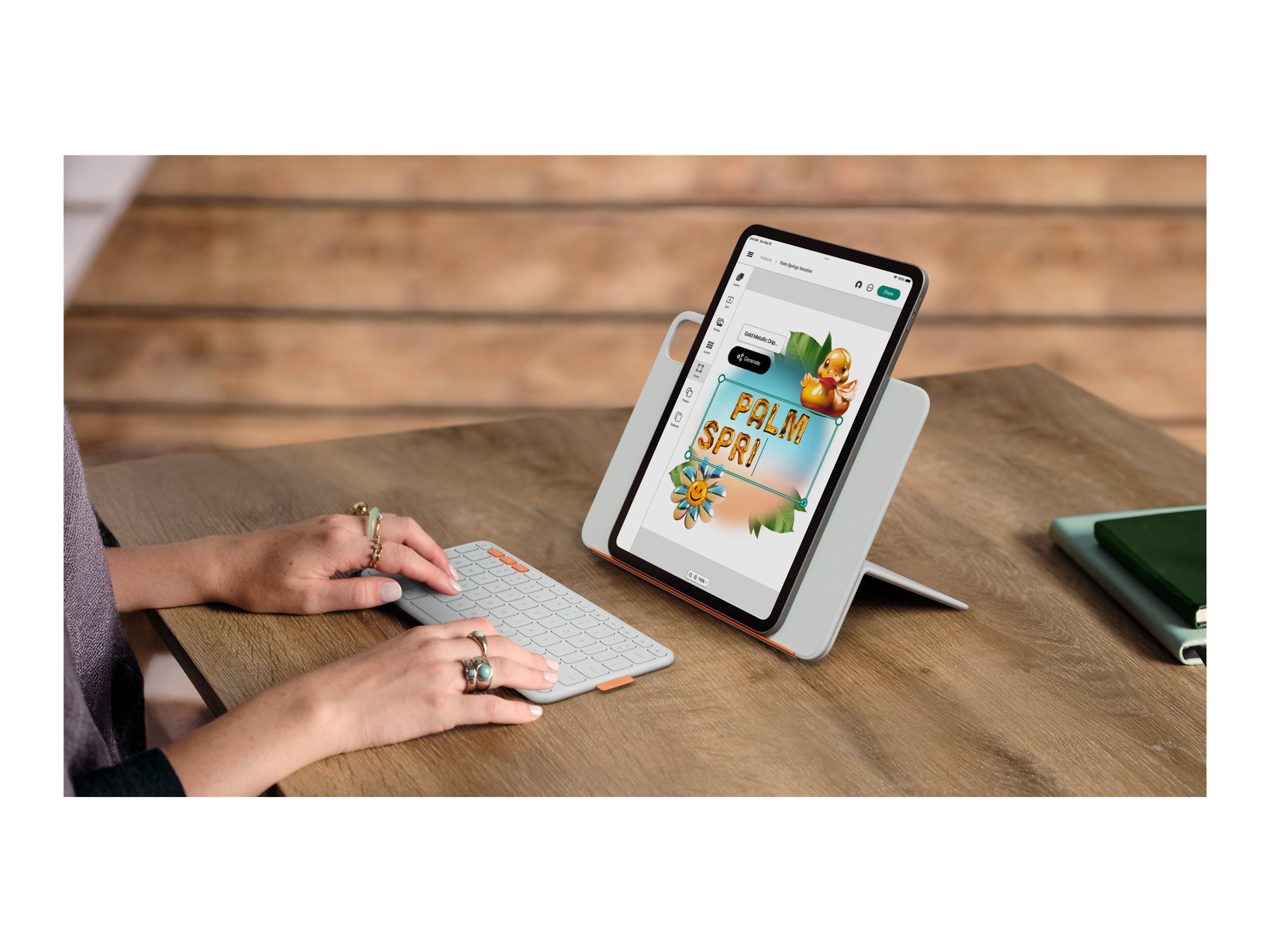 Aufklappen und Spaß haben. Oder volle Konzentration. Die Bluetooth-Tastatur kann ganz einfach abgenommen und überall platziert werden. Dank Magnetfunktion ist sie dann genauso schnell wieder am Case verstaut. Stellen Sie die Halterung auf den richtigen Winkel ein und positionieren Sie das iPad im Quer- oder Hochformat.