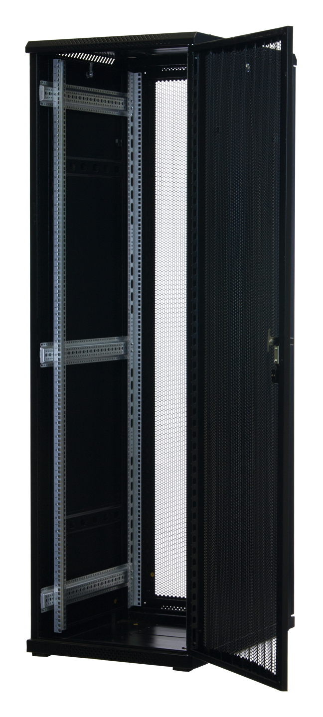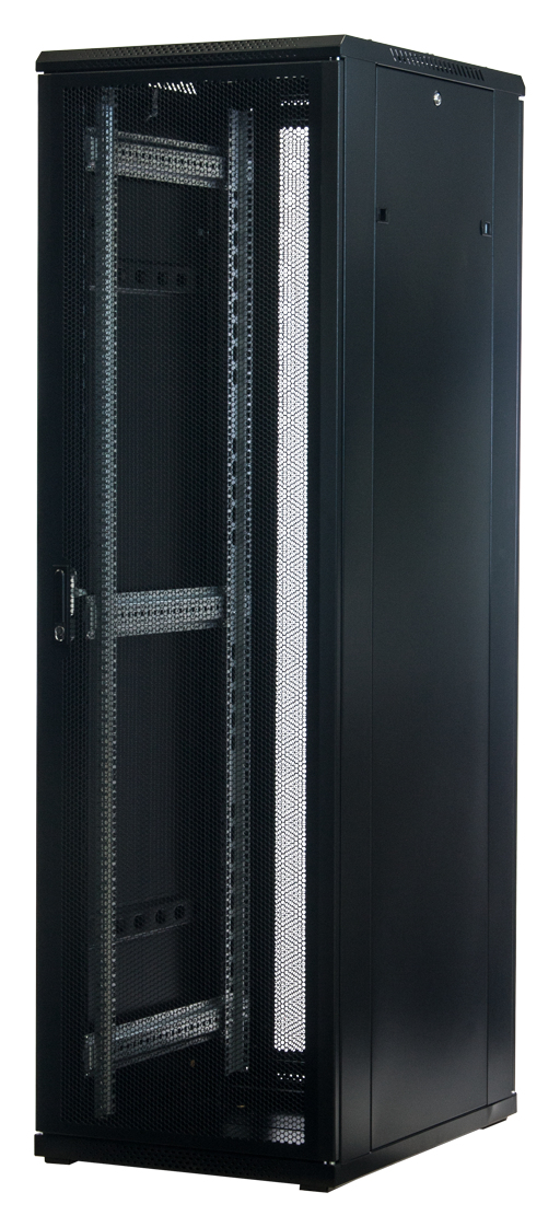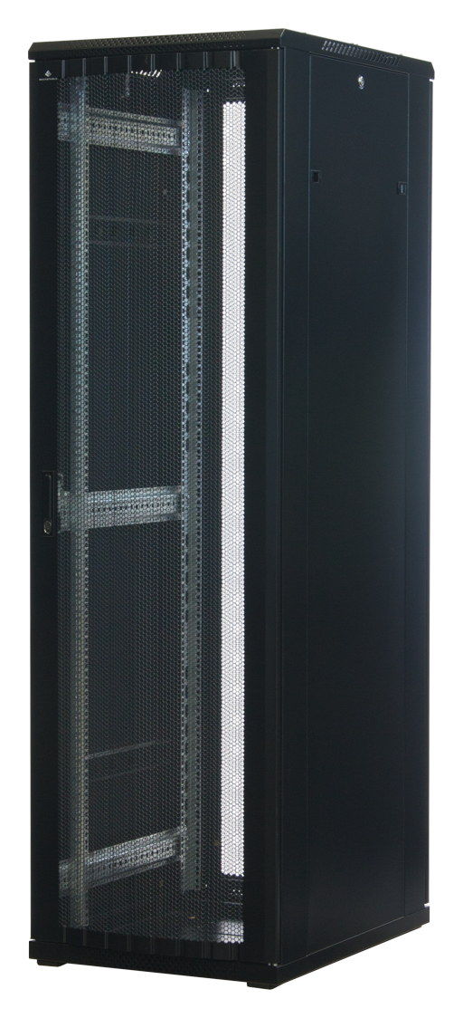 Rockstable 42 HE 19" Serverschrank mit Gitternetztüren. Typ: Freistehendes Gestell, Rack-Kapazität: 42U, Höchstgewichtskapazität: 800 kg, Sperrschloss, Verstellbare Füße, Ablageschienen, Internationale Schutzart (IP-Code): IP20, Lenkrollen, Produktfarbe: Schwarz