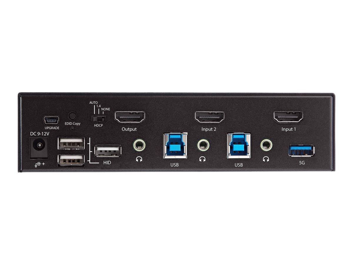 StarTech.com 2 Port HDMI KVM-Switch - Einzelmonitor 4K 60Hz Ultra HD HDR - HDMI 2.0 KVM Umschalter mit 2 Port USB-3.0-Hub (5 Gbit/s) und 4x USB 2.0-HID, Audio - Hotkey - TAA. Tastatur Porttyp: USB, Maus-Porttyp: USB, Video Porttyp: HDMI. HD-Typ: 4K Ultra HD, Maximale Auflösung: 3840 x 2160 Pixel, Datenübertragungsrate (max): 5 Gbit/s. Produktfarbe: Schwarz, Gehäusematerial: Stahl, Mittlere Betriebsdauer zwischen Ausfällen (MTBF): 143000 h. Eingangsspannung: 100 - 240 V, Eingangsstrom: 1 A, Ausgangsspannung: 12 V. Breite: 100 mm, Tiefe: 160 mm, Höhe: 40 mm