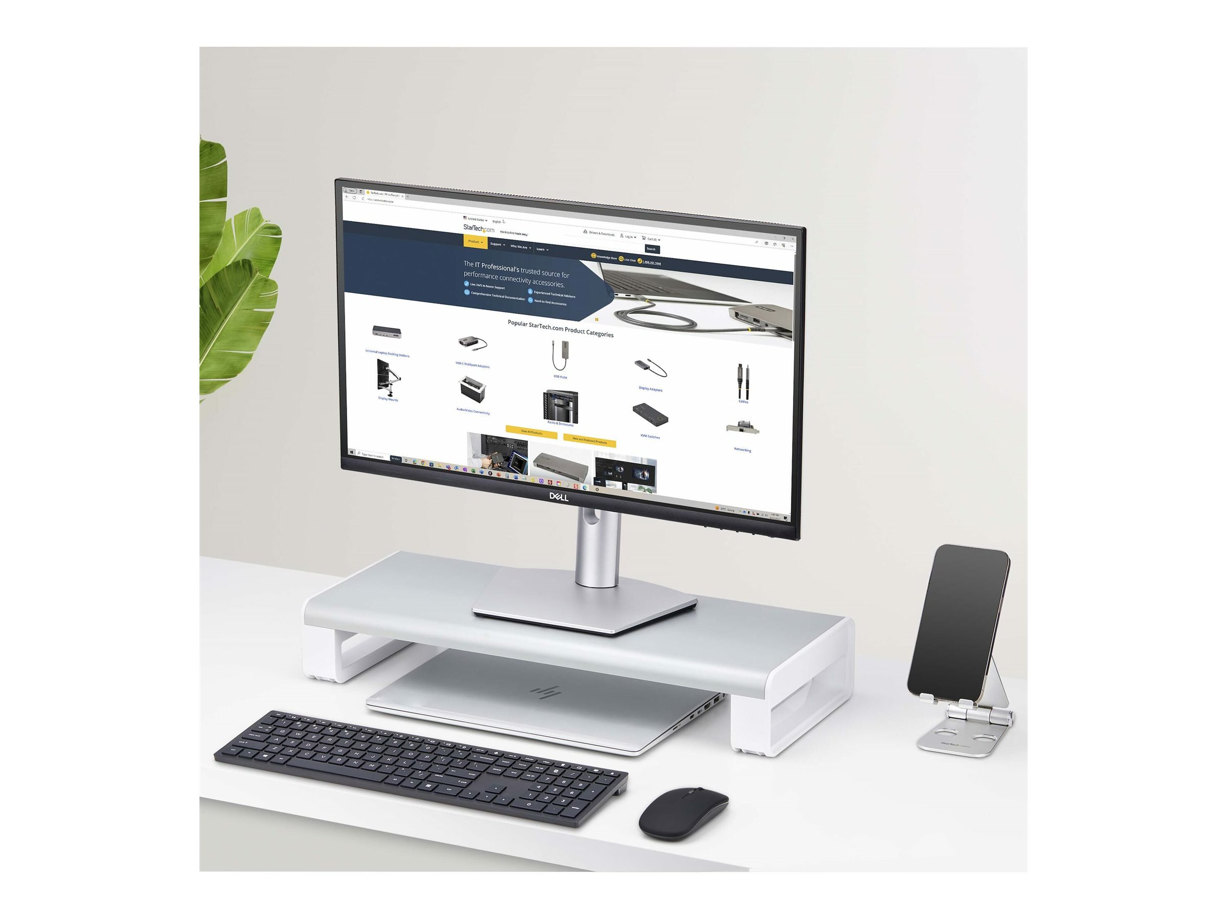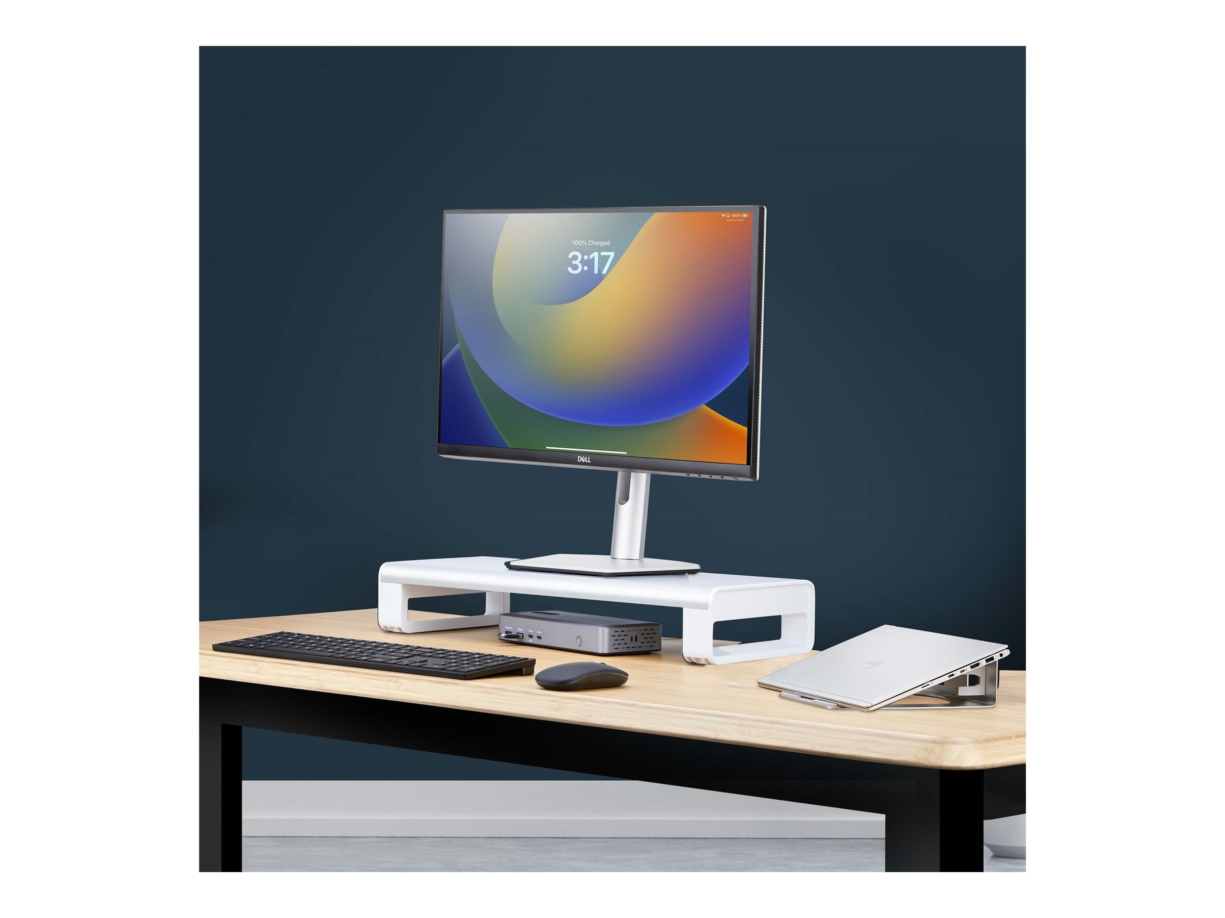 Verbessern Sie die Ergonomie und den Arbeitsplatz mit dieser Schreibtisch Bildschirmerhöhung Schaffen Sie eine ergonomische Arbeitsumgebung mit diesem stabilen Monitorständer. Bringen Sie den Bildschirm auf Augenhöhe, um ihn bequem betrachten zu können, und schaffen Sie gleichzeitig mehr Platz und Ordnung auf Ihrem Schreibtisch. Optimieren Sie den Platz am Schreibtisch Der Riser mit fester Höhe (90,5 mm) eignet sich für Desktop-Bildschirme oder Laptops bis zu 15kg. Schaffen Sie Platz auf dem Schreibtisch und verstauen Sie Tastatur, Maus oder Zubehör bequem darunter, wenn sie nicht gebraucht werden. Die nutzbare Gesamtfläche beträgt 186x534mm). Rutschschutz und Stabilität Rutschfeste Unterlagen an der Unterseite sorgen für Stabilität und schützen die Schreibtischoberfläche. Die Gesamtabmessungen sind 544,6x220x90,5mm. Einfache Montage Mit nur drei Hauptbestandteilen schnell zusammengebaut und aufgestellt. Die Plattform ist aus robustem Stahl gefertigt, der für Robustheit und Langlebigkeit sorgt.
